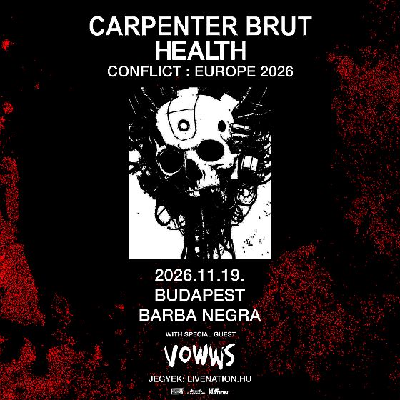 A turnén ráadásul vele tart a Los Angeles-i industrial rock trió, a Health is, akik legutóbb az A38 Hajót mozgatták meg avantgárd hangzásvilágukkal. A zenekar tavaly év végén adta ki Conflict DLC nevű új nagylemezét, amelyen még inkább elmosták a műfaji határokat. Carpenter Brut és a Health vendége a VOWWS lesz, akik misztikus death pop zenéjükből adnak majd kóstolót.